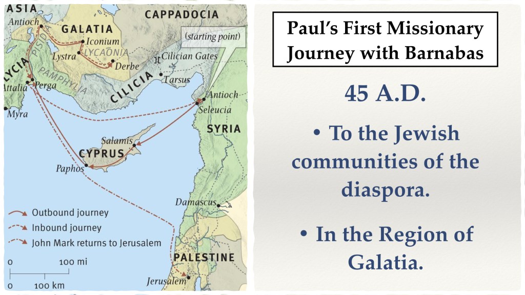 Opening: The book of Galatians is a letter sent to a region of churches in an area known as Galatia (thus the title of the book). This area of Galatia is the area that Paul planted churches in during that first missionary journey with Barnabas (Acts 13 and 14). The book of Acts records two journeys for Paul before his arrest in Jerusalem (Acts 21). His first journey, the one with Barnabas, is done among the Jewish population dispersed within in the old empires of the Babylonians or Assyrians. Paul and Barnabas would find the local synagogue and preach the gospel. (Note: Paul’s second missionary journey was into modern day Greece, an area that was not a part of the pre-Roman Empires of Babylon or Assyria / Persia and thus was a radically different cultural context for Paul to proclaim the Gospel in). Since there was a such strong traditional Jewish context among those first churches that Paul and Barnabas planted a natural question that arose was what does it mean to be a Christian in context to the law of Moses? This question was especially important for those who were never Jewish (i.e. gentiles). Paul and Barnabas traveled to Jerusalem to meet with Peter and other people who knew Jesus to ask this question about the law. This meeting is called the Jerusalem Council and can be found in Acts 15 (We will talk more about this gathering when we get to Galatians 2). The point is that Peter, an apostle or Jesus, affirmed the very same gospel that was given to Paul through revelation in Jesus. Here is a part of Peter’s speech at the council; “9 and he made no distinction between us and them, having cleansed their hearts by faith. 10 Now, therefore, why are you putting God to the test by placing a yoke on the neck of the disciples that neither our fathers nor we have been able to bear? 11 But we believe that we will be saved through the grace of the Lord Jesus, just as they will (Acts 15:9–11 ESV).”