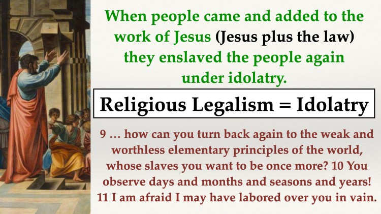 But something happened among these early churches freed by the Gospel. People came after Paul had left and told these people that faith is not enough. That for God to know you and bless you and save you, you need to start performing certain rituals and follow specific laws. And one of the consequences of this legalism was the reinstatement of a caste system. We can see this caste system in how Jews no longer ate with Gentiles. The wealthy Christians would eat the Lord’s supper first and give the leftovers to the more impoverished Christians (1 Corinthians 11). Those who had certain spiritual gifts kept themselves apart from those that could not speak in tongues (also 1 Corinthians). These divisions are why Paul is showing that the legalism that has come into the church is just another form of idolatry seen in how it causes divisions and enslavement. Adding to the work of Jesus, turning faith into legalism is idolatry. 9 But now that you have come to know God, or rather to be known by God, how can you turn back again to the weak and worthless elementary principles of the world, whose slaves you want to be once more? 10 You observe days and months and seasons and years! Paul is giving them an example of how their legalism has turned into a system of idolatry. “I am afraid I may have labored over you in vain (verse 11)”. In other words, Paul is wondering, were you ever really free of idols?