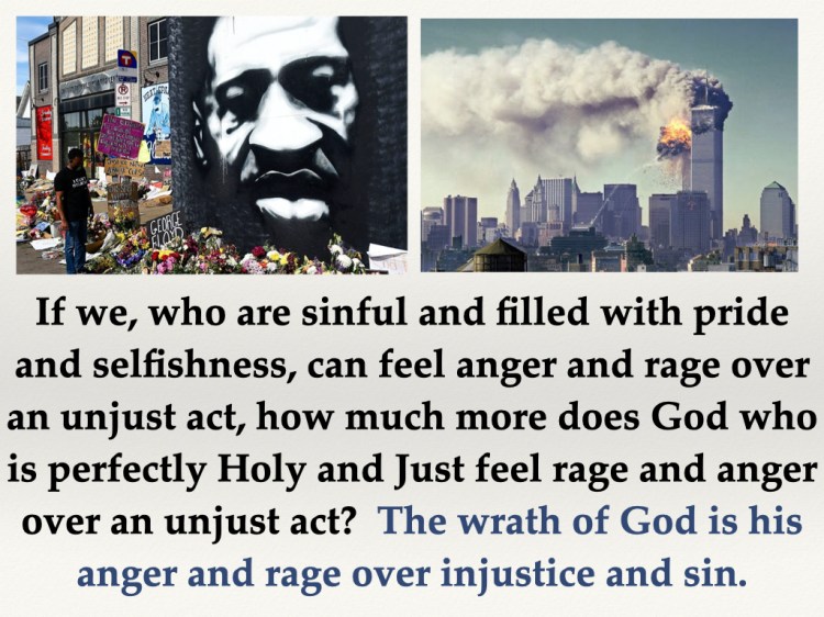 On May 25th of this year, a man by the name of George Floyd was killed by a police officer in Minneapolis, Minnesota. I think you would agree that what happened to George Floyd was a crime and a heinous act of brutality. In the days that followed, because of that unjust and brutal death of George Floyd, people raged. Peaceful protests quickly turned violent, stores were plundered, and buildings were set on fire. The acts of violence were the outflow of the rage and wrath because of gross injustice. Nineteen years ago, on September 11, four planes were hijacked by terrorists. Two were flown into the trade towers of New York City, killing thousands; one was flown into the Pentagon, and the last one crashed into an open field. Our nation, after this terrorist attack, was enraged and in its wrath, entered a war a month later that lingers on today.