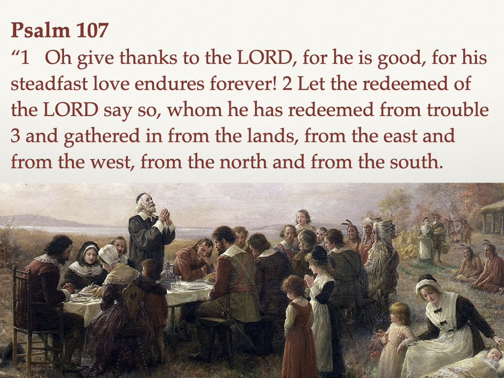 Psalm 107 describes life. Life has valleys, and it has mountaintops, ups, and downs. What do you think the Pilgrims did in the valleys of life? They did Psalm 107, “they cried out to the Lord and gave thanks to the Lord.” What do you think they did on the mountain tops? They did Psalm 107, “they cried out to the Lord and gave thanks to the Lord.” It is time for us to do the same. It is time for us as a nation and as individuals to cry out to God and give Him thanks, for great is his love. Amen.