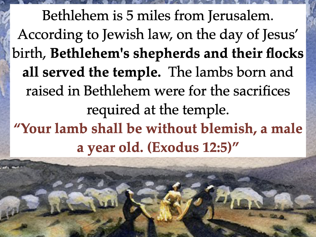 Bethlehem, the town where David is from, sits just over 5 miles from Jerusalem. It is not very far. According to Jewish law, during the days of Jesus’ birth, Bethlehem’s shepherds and their flocks all served the temple. Due to Bethlehem’s proximity to Jerusalem, the lambs raised in Bethlehem were for the sacrifices required at the temple. According to Jewish law known as Mishnah, herds of animals were actually forbidden to be kept anywhere in the land except in the wilderness (Bab K. 7:7; 80a). But the animals for the temple sacrifices could be kept in places like Bethlehem. These shepherds served the temple; they may have even been a priestly order. It was their job to provide to the temple unblemished lambs for sacrifice. We read in places like Exodus 12:5, where instructions for the Passover sacrifice are given, they are told, “Your lamb shall be without blemish, a male a year old.”