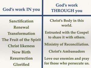 If you are a Christian, if you have trusted your life to Jesus, God is at work doing two things regarding your life. God is at work IN you, and God is at work THROUGH you.
